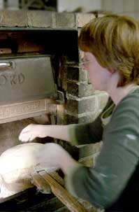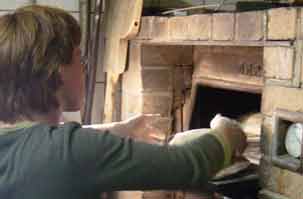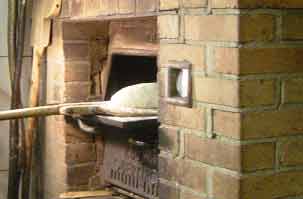 mit Holz vorgeheizten Backofen wird nun das Brot auf dem Brotschieber