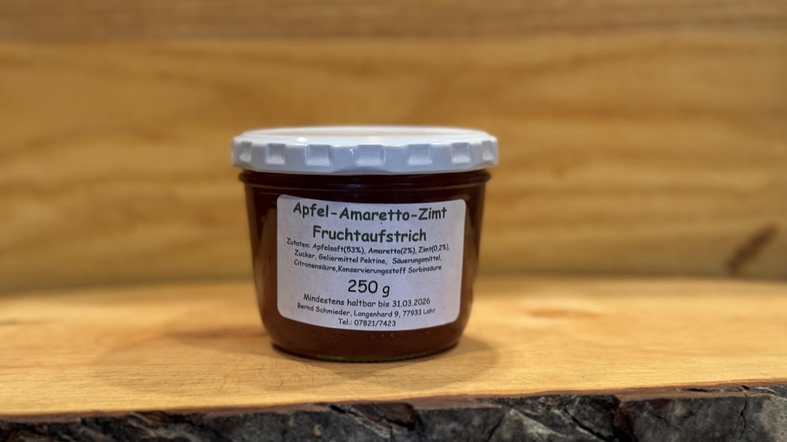 Sie erhalten einen milden Aufstrich aus Apfelsaft, Amaretto und etwas Zimt. Der Geschmack wirkt rund und leicht würzig. Der Aufstrich eignet sich für Brot, Crêpes und Joghurt. Viele schätzen den sanften Alkoholton und die dezente Süße. Die Konsistenz bleibt streichzart und stabil. Ideal für ein aromatisches Frühstück.