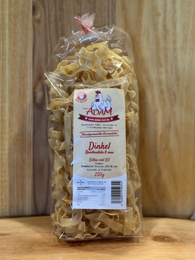 Diese Dinkel-Bandnudeln liefern einen harmonischen Geschmack und einen ausgewogenen Biss. Der hohe Ei-Anteil sorgt für eine glatte Struktur und eine warme, goldene Farbe.