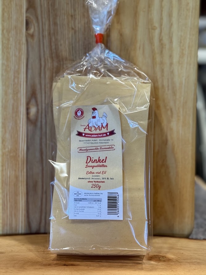 Sie bekommen Lasagneblätter aus Dinkel mit einem hohen Eianteil. Die Blätter bringen eine stabile Struktur und bleiben beim Backen formtreu. Der Dinkel sorgt für einen runden Geschmack und eine leichte Nussnote.