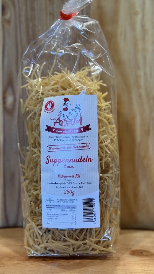 Diese Suppennudeln sind dünn geschnitten und eignen sich gut für klare Brühen und leichte Eintöpfe. Der hohe Ei-Anteil sorgt für einen runden Geschmack und eine stabile Konsistenz.