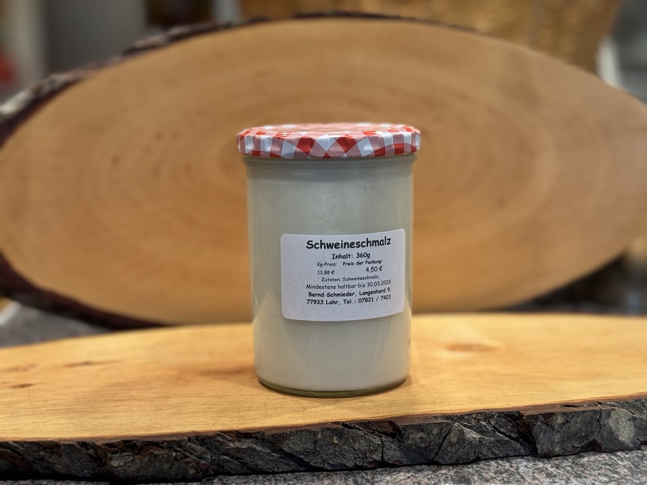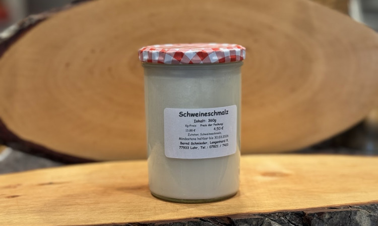 Sie erhalten reines Schweineschmalz im Glas. Es eignet sich gut zum Braten und Schmoren. Sie verfeinern damit deftige Rezepte. Die feste Konsistenz löst sich sauber in der Pfanne. Sie streichen es auch direkt auf Brot. Das Produkt passt gut in eine klassische Küche.