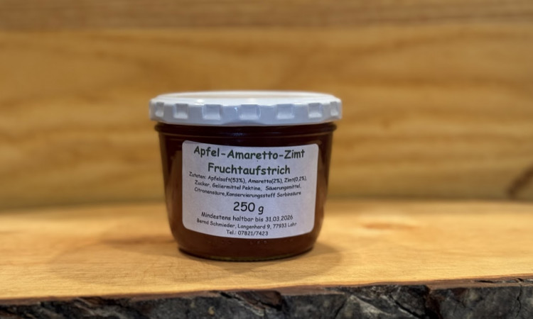 Sie erhalten einen milden Aufstrich aus Apfelsaft, Amaretto und etwas Zimt. Der Geschmack wirkt rund und leicht würzig. Der Aufstrich eignet sich für Brot, Crêpes und Joghurt. Viele schätzen den sanften Alkoholton und die dezente Süße. Die Konsistenz bleibt streichzart und stabil. Ideal für ein aromatisches Frühstück.