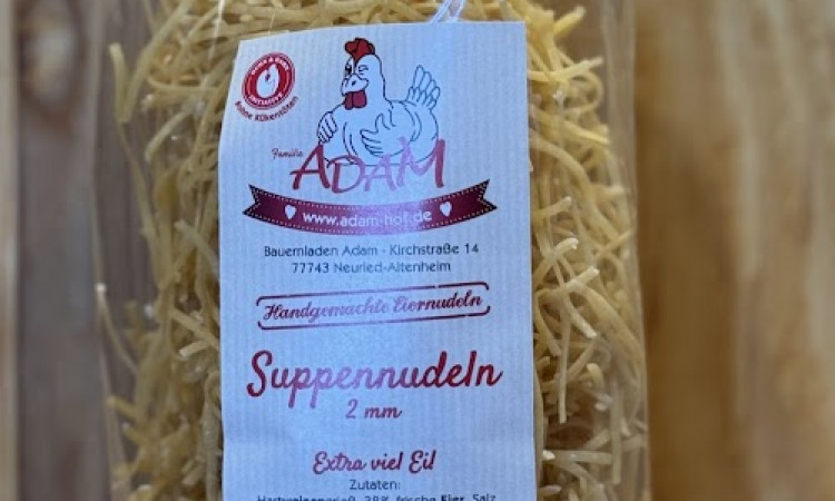 Diese Suppennudeln sind dünn geschnitten und eignen sich gut für klare Brühen und leichte Eintöpfe. Der hohe Ei-Anteil sorgt für einen runden Geschmack und eine stabile Konsistenz.