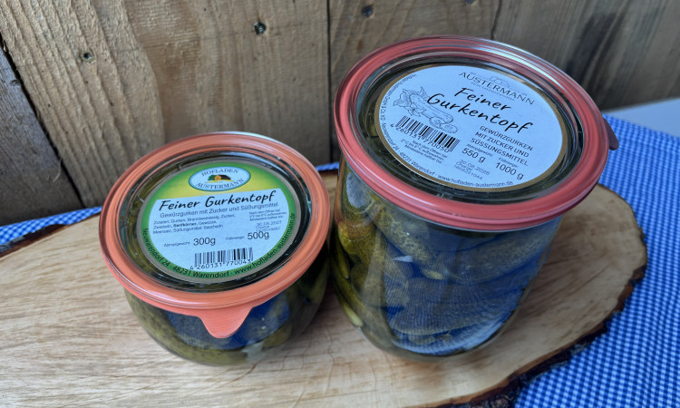 Der feine Gurkentopf vom Hofladen Austermann ist ein süß-würzig eingelegtes Gurkengericht mit knackiger Textur und aromatischem Geschmack.