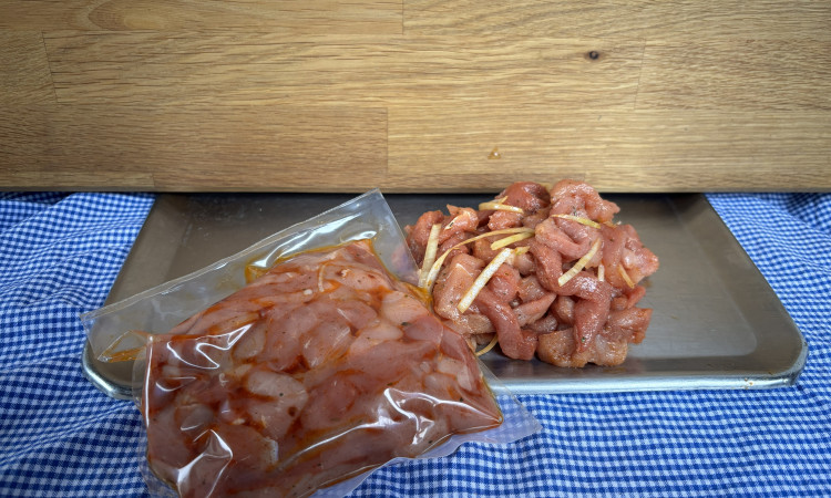 Gyrosgeschnetzeltes besteht aus in Streifen geschnittenem Schweinefleisch, das kräftig mit typischen Gyros-Gewürzen gewürzt und mit Zwiebelstreifen vermischt wird. Es wird scharf angebraten. Der Geschmack ist würzig, leicht pikant und sehr aromatisch. Typische Beilagen sind Reis, Pommes oder Tzatziki.
