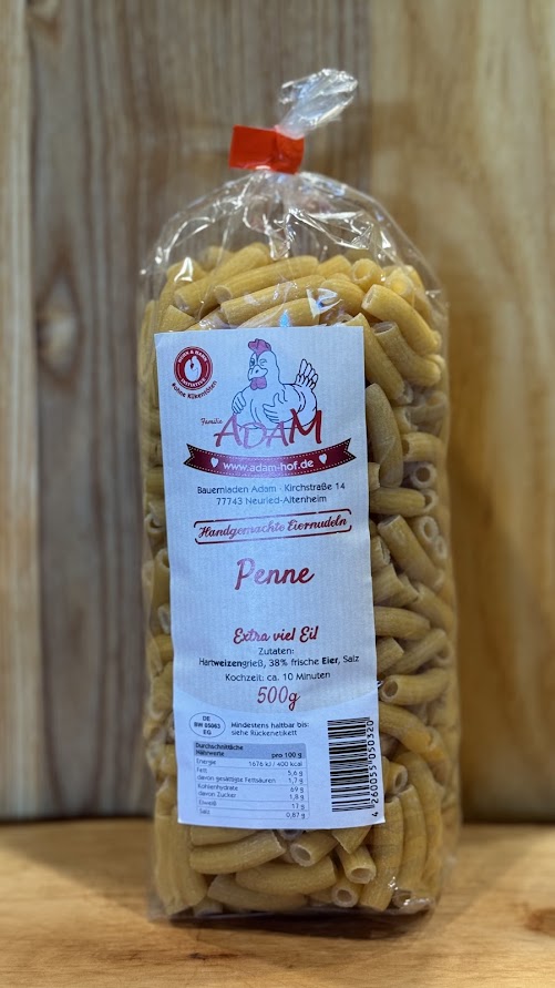 Diese Penne entstehen aus Hartweizengrieß und frischen Eiern. Die Röhrenform eignet sich für tomatige Saucen, Cremes und Aufläufe.