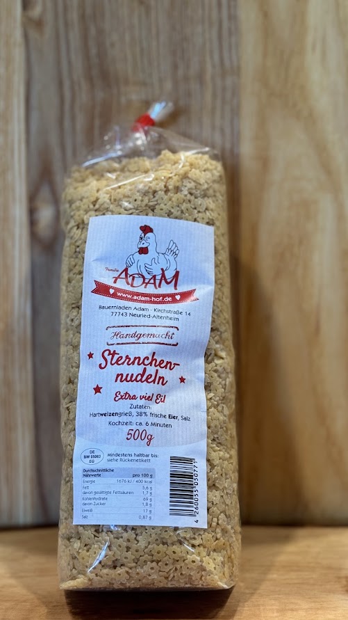 Diese Sternchennudeln bringen Struktur und Geschmack in klare Suppen, Eintöpfe und leichte Gerichte. Sie bestehen aus Hartweizengrieß und einem hohen Anteil an frischen Eiern.