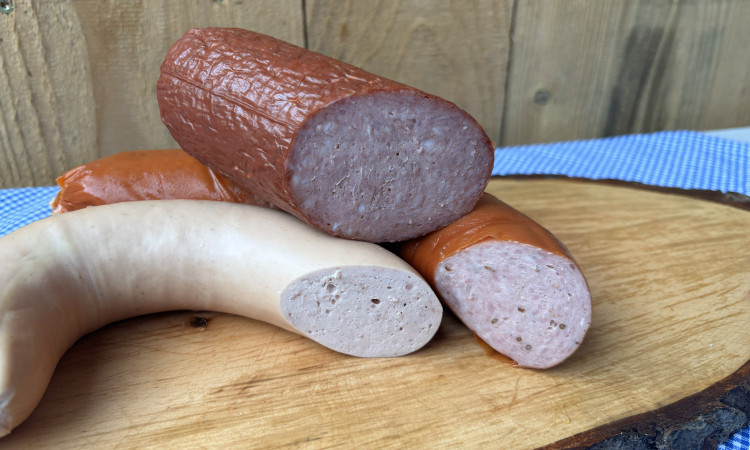 Das Foto zeigt eine Krakauer und eine Fleischwurst im Ring. Die Krakauer wirkt kräftig geräuchert. Die Fleischwurst hat eine glatte, helle Hülle. Rauchlyoner wird ebenso geräuchert, ist mild würzig. Alle eignen sich gut für einen Imbiss. Die natürliche Bindfaser an den Enden signalisiert Handwerk.