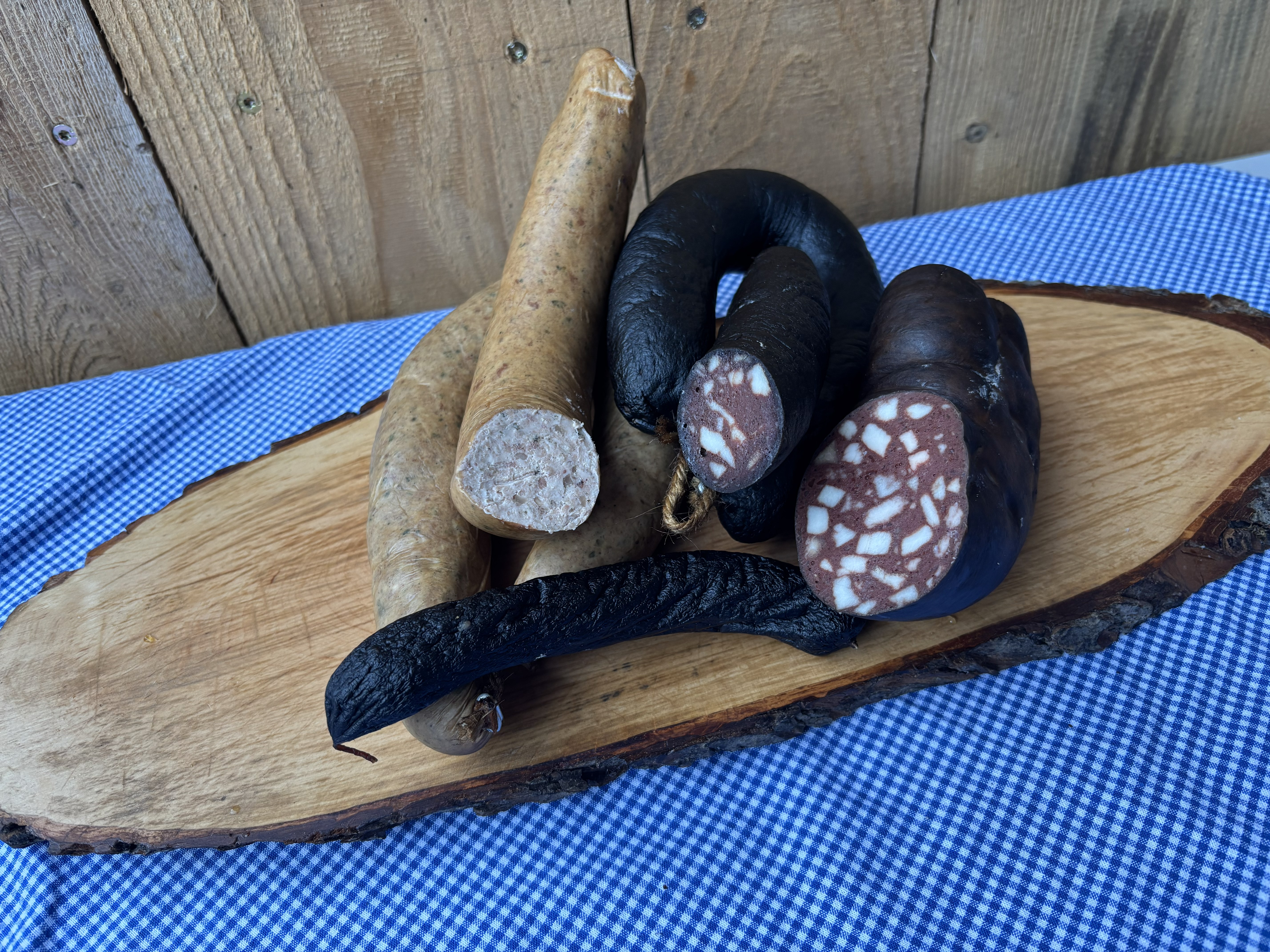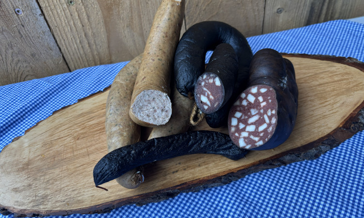 Sie sehen zwei klassische Hausmacherwürste. Die geräucherte Leberwurst bietet ein mildes Aroma und eine weiche Konsistenz. Die dunklere Schwarzwurst wirkt kräftiger und würziger. Beide Sorten eignen sich für eine Brotzeit. Die Produkte werden traditionell im Ring und im Naturdarm hergestellt.