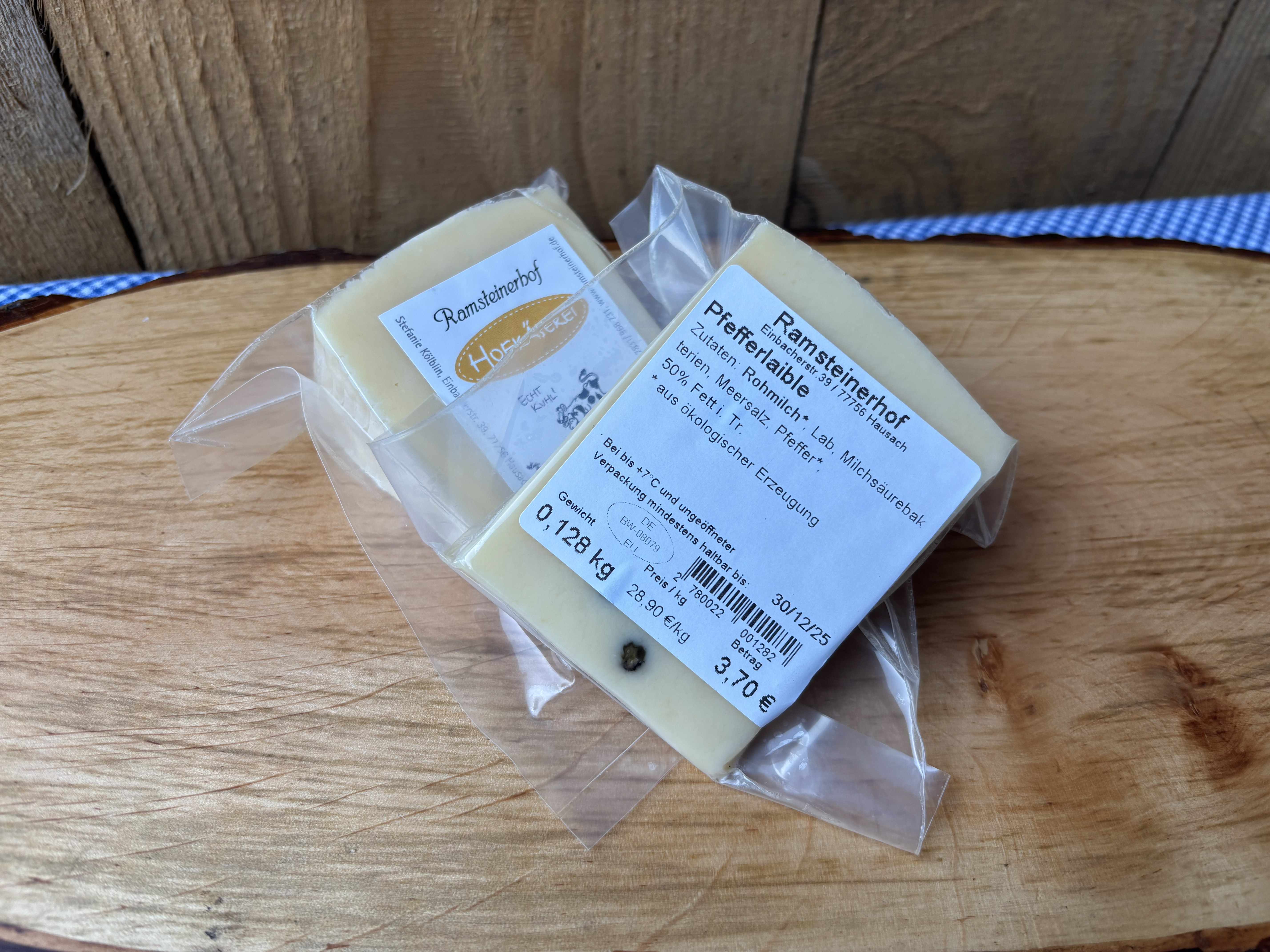 Pfefferkäse ist ein würziger Käse mit kräftigem Charakter. Ganze oder grob gemahlene Pfefferkörner sorgen für eine pikante Schärfe, die den cremigen bis festen Käseteig aromatisch abrundet.