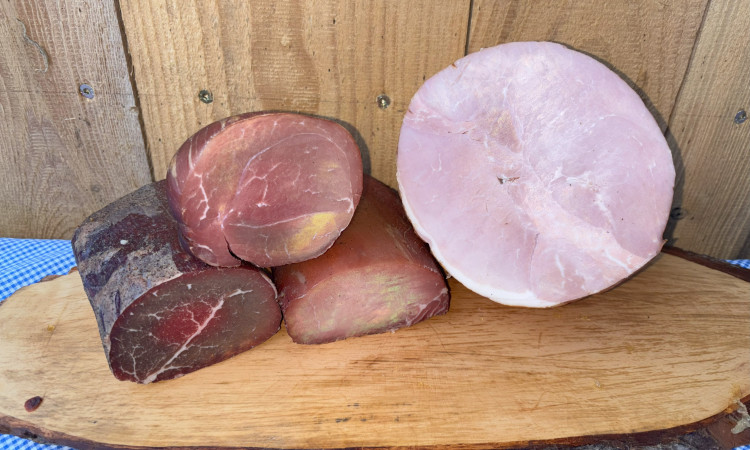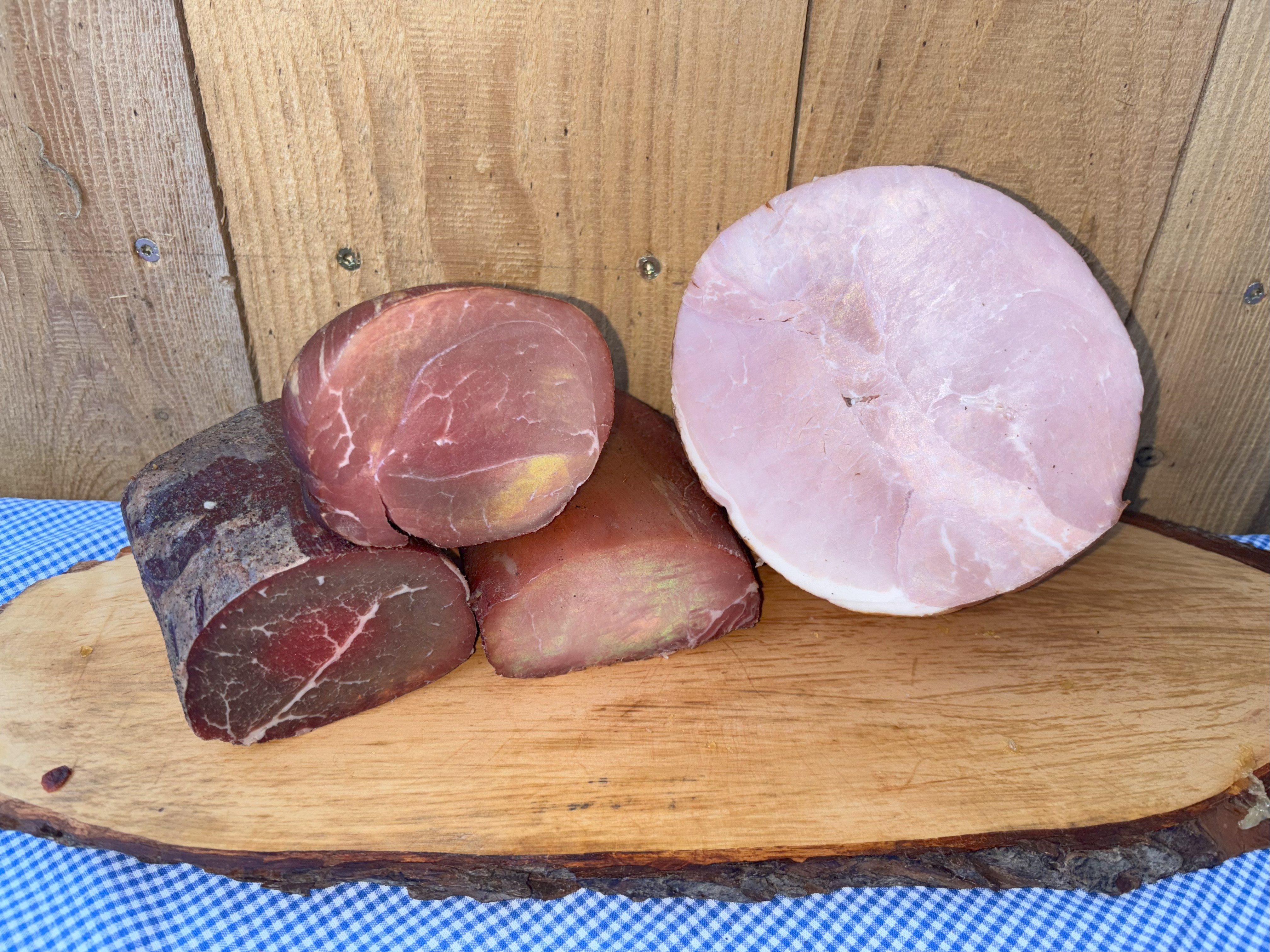 Sie bekommen luftgetrockneten rohen Schinken und milden gekochten Schinken. Die Stücke zeigen eine feste Struktur. Der rohe Schinken bringt ein kräftiges Aroma. Der gekochte Schinken wirkt milder. Beide Sorten eignen sich für Vesper, Brotzeit und kalte Platten.