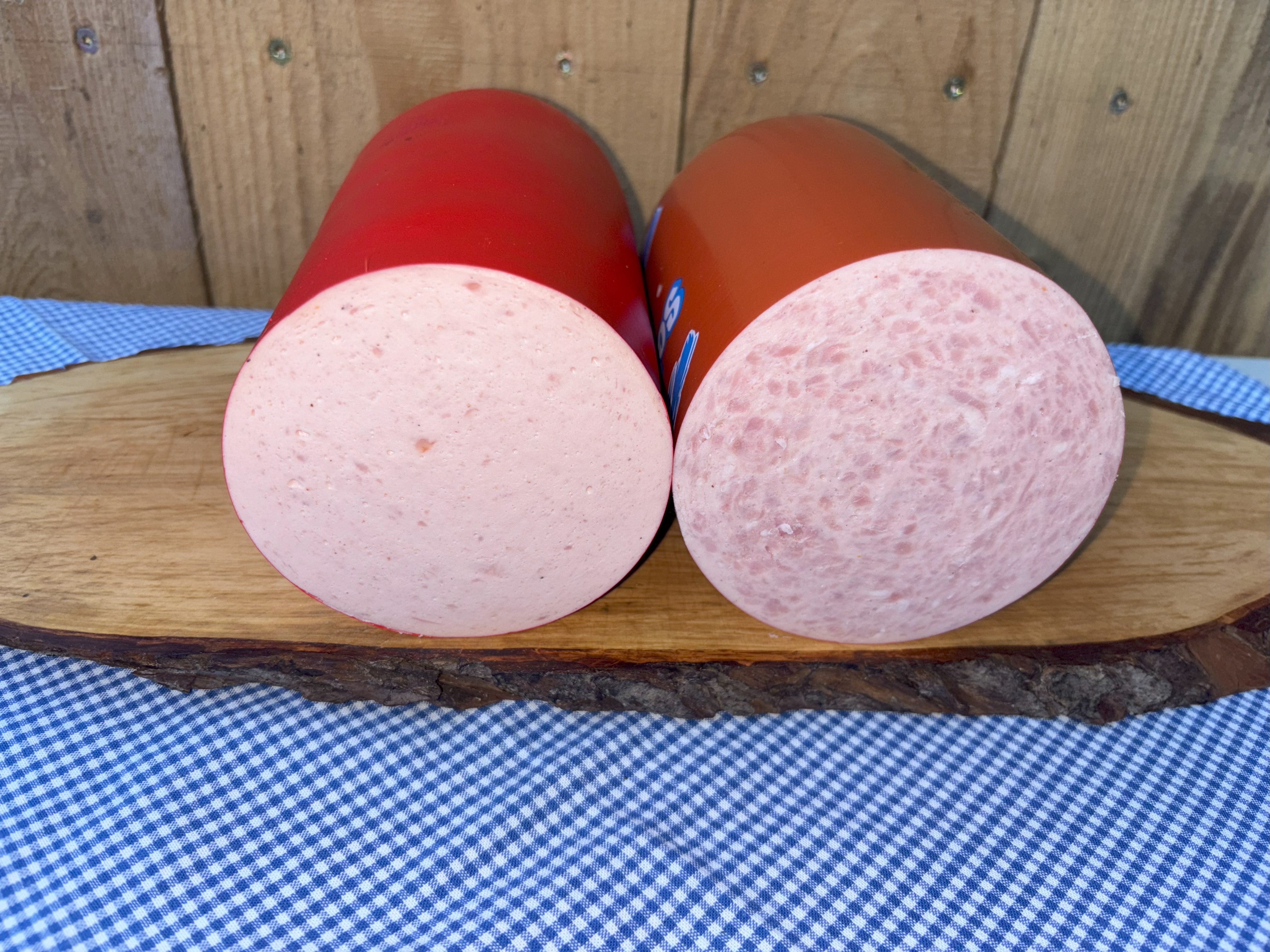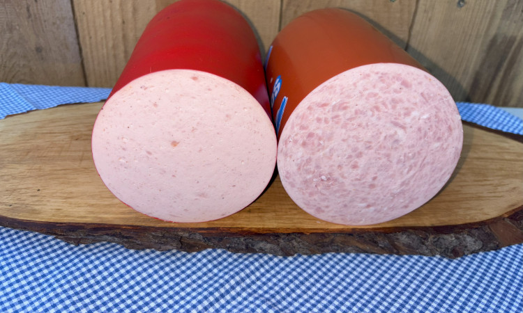 Sie erhalten zwei klassische Aufschnittsorten. Die Schinkenwurst zeigt eine fein marmorierte Struktur. Die Lyoner wirkt heller und gleichmäßig gebunden. Beide Sorten passen auf Brot, in Salate oder für eine kalte Platte. Die Produkte schneiden sich sauber und bleiben formstabil.